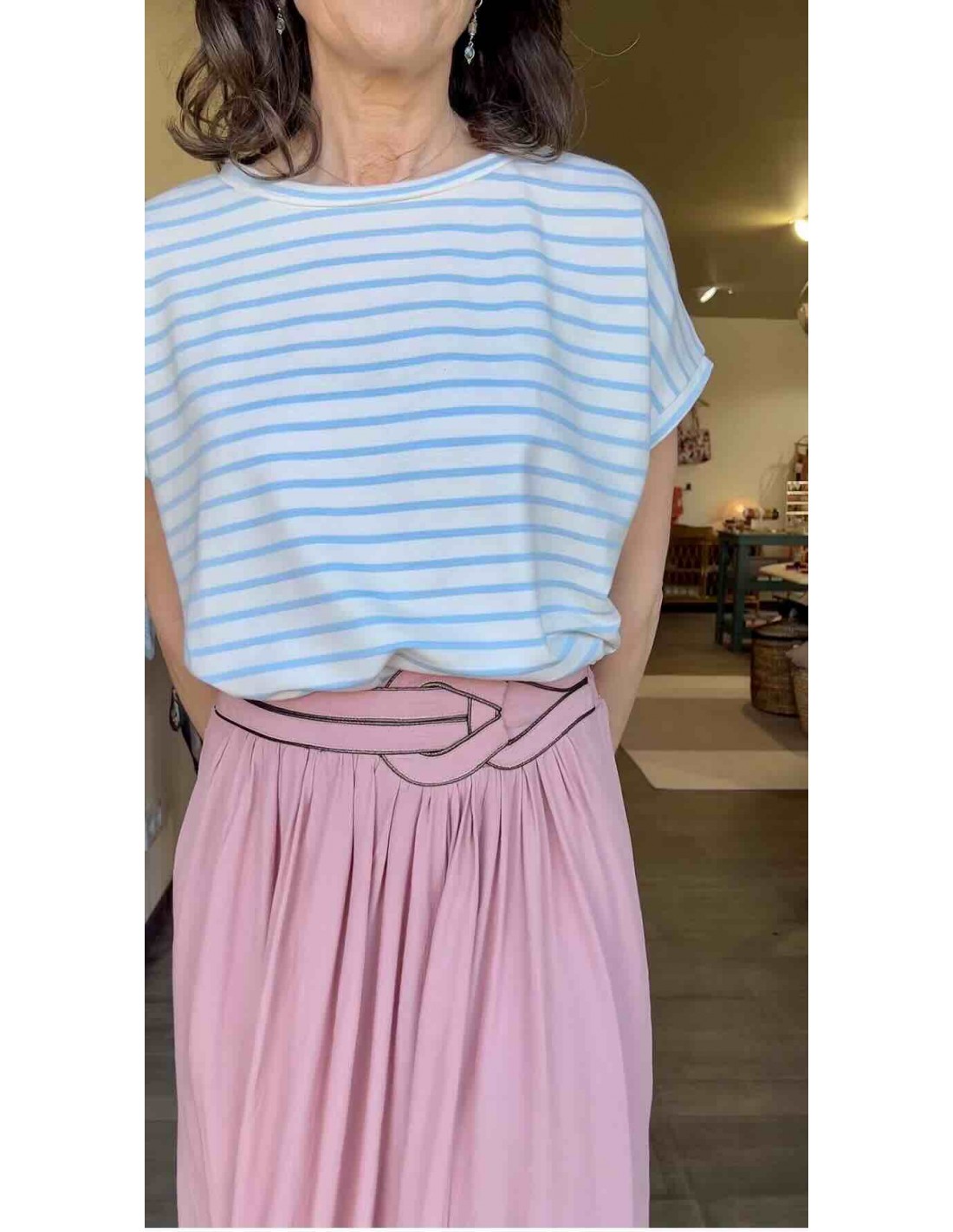 Son secret réside dans sa coupe fluide et aérienne, qui épouse délicatement les mouvements, offrant une sensation de légèreté et de liberté. Le tissu, souvent choisi pour sa qualité et son tombé impeccable, caresse la peau et sublime la silhouette. Mais ce qui fait véritablement l'identité de cette jupe, c'est sa ceinture signature.