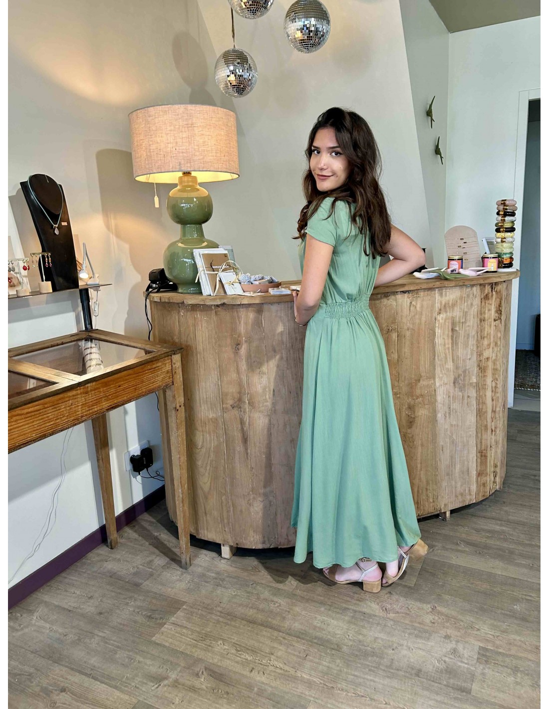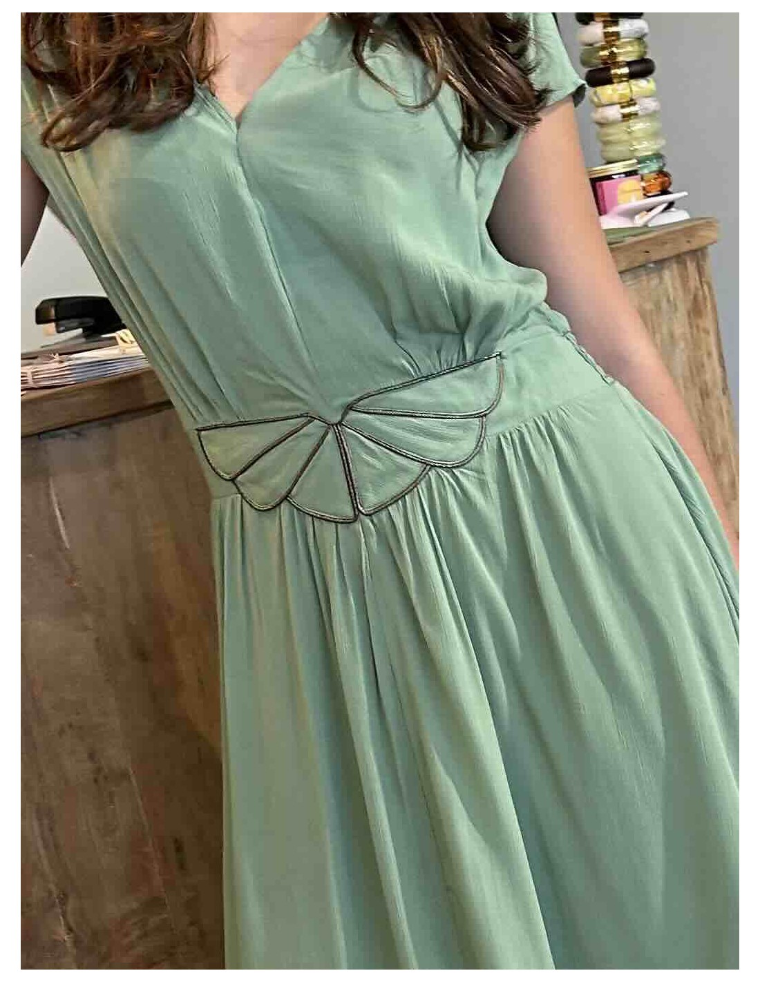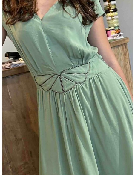 Sa longueur midi et son tombé fluide créent un mouvement gracieux à chaque pas, renforçant cette allure à la fois romantique et moderne. Déclinée ici en teintes profondes comme le bleu nuit ou en vert doux et naturel, elle s'adapte aussi bien à une journée ensoleillée qu'à ne soirée élégante.
