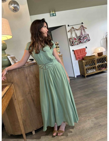 Avec sa coupe aérienne et son tissu léger en viscose naturelle, elle épouse délicatement la silhouette tout en offrant une sensation de liberté et de confort. Le décolleté en V sublime le port de tête, tandis que la taille est joliment marquée par une ceinture subtile et féminine qui attire le regard.